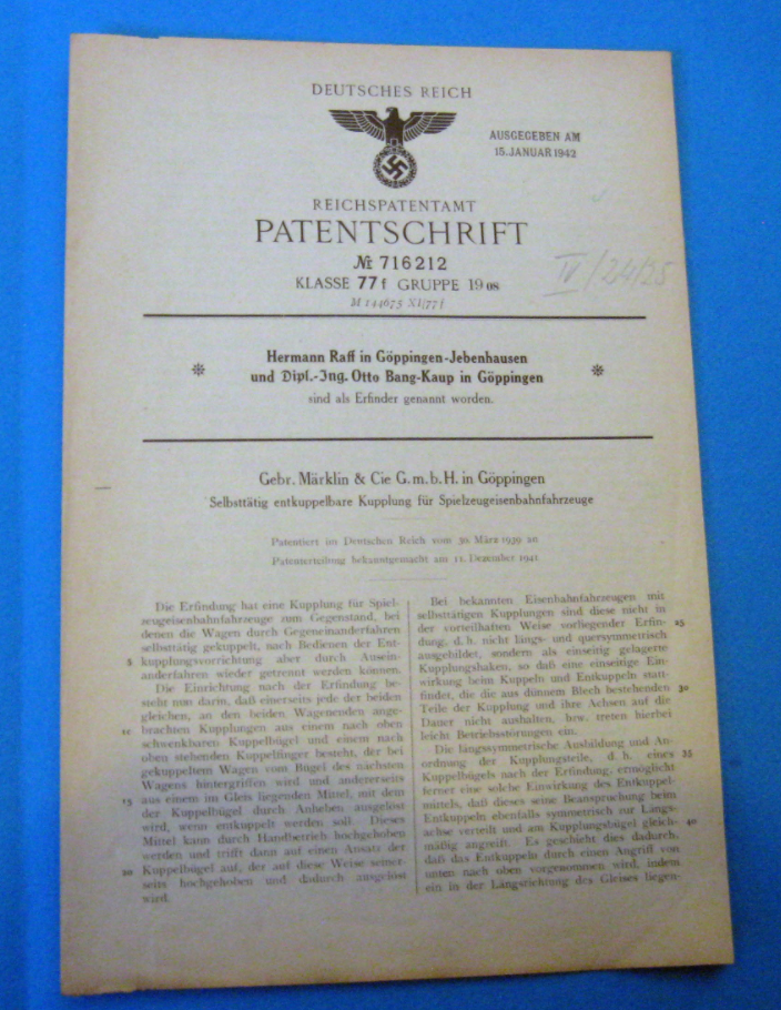 The above patent from the 6th of October 1909 detail the ingenious coupling design Marklin devised in the early 1900s. This design was crucial to the easy and reliable coupling and uncoupling of locomotives and cars. The design featured a “tongue and slot” mechanism with a small cross-pin which securely attaches the couplers together. This design replaced the earlier “loop” couplers and maintained in existence until the end of O Gauge production.